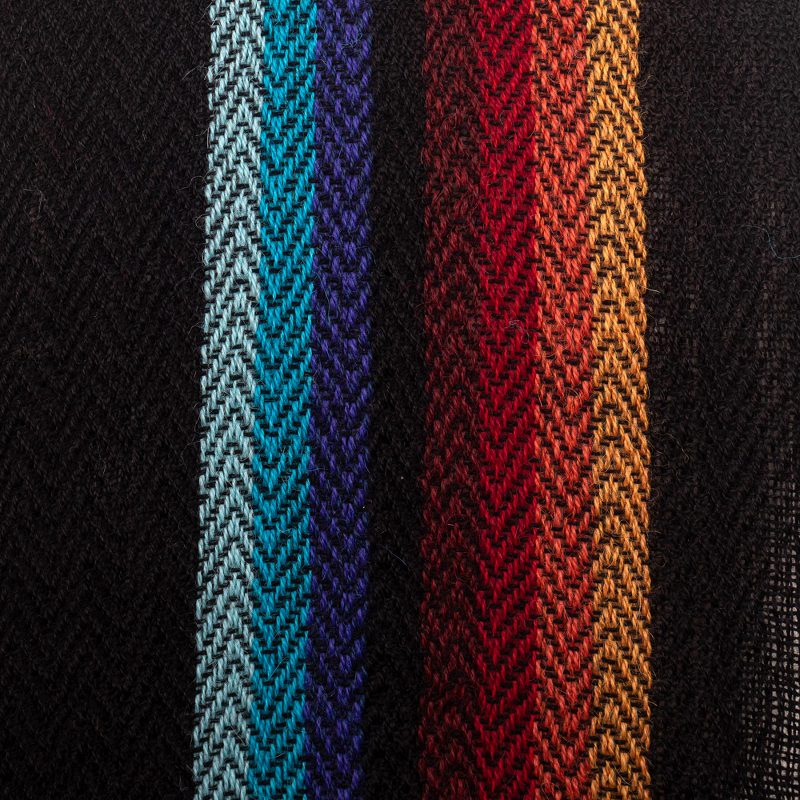 The Ulloa Family in Peru combines black with colorful rainbow stripes to create this elegant unisex scarf. The scarf is woven on an artisanal loom from pure 100% alpaca, known for its lightweight warmth and softness. Fringe accents both ends.