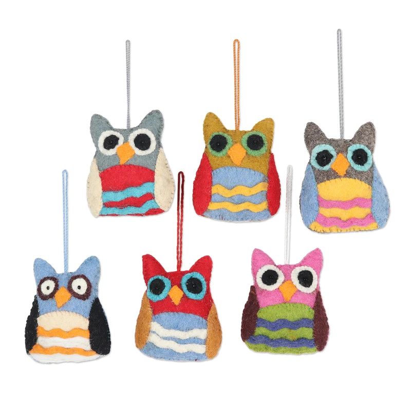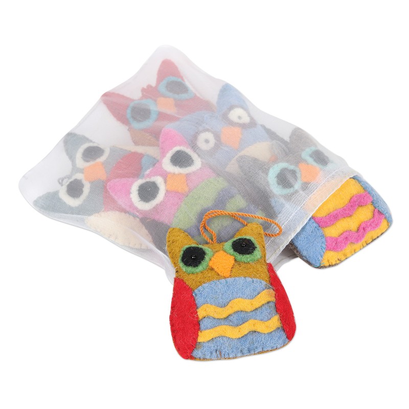 Six colorful owls are ready to add their unique charm to your Christmas tree. Renu Rani in India designs the set of six ornaments, which is crafted from wool felt and plumped with polyfill. They arrive in an organza storage bag.