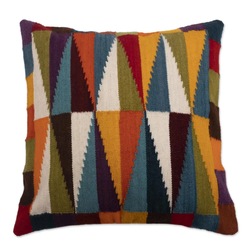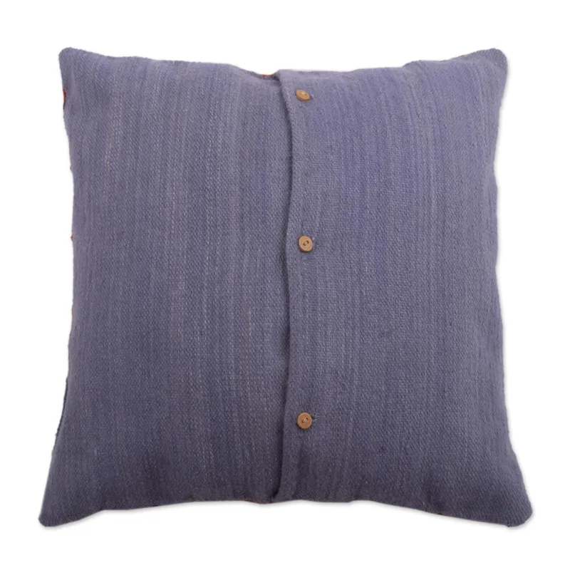 Despite being woven on a traditional wooden loom, this beautiful cushion cover has modern appeal. Zosimo Laura in Peru designs the cover, which features a vibrant diamond motif on the front and a solid blue back. The cover is crafted from pure wool yarns on a cotton warp, and features a button opening on the back for inserting a cushion.