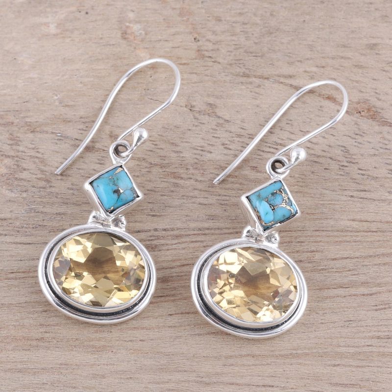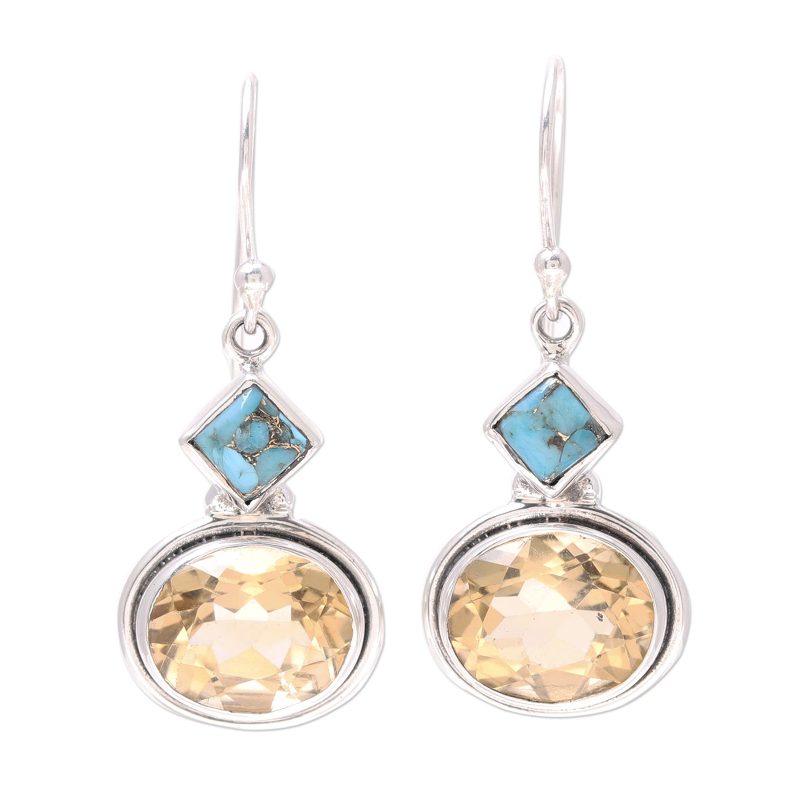 Featuring an impressive nine carats of sparkling citrine ovals, these dangle earrings bring the majesty of ocean treasure to your wardrobe. Indian artisans craft the earrings of sterling silver, cradling square stones of composite turquoise. Neeru Goel presents this accessory.