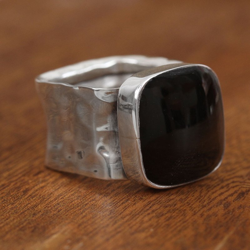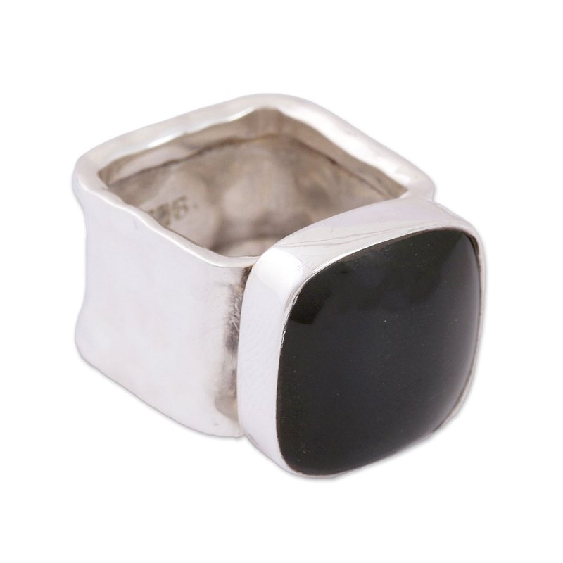 Working in the style of Taxco silver, Mexican artisan Alon Diller creates a cocktail ring of stunning beauty. This ring encircles the finger with a band of hammered sterling silver, crowned by a single piece of natural obsidian that features a dark hue.