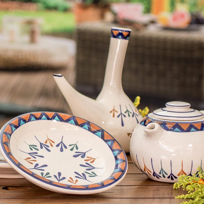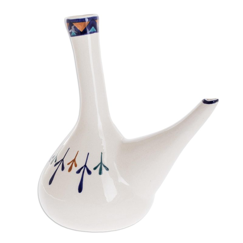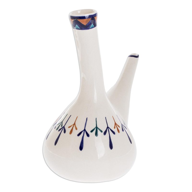 The sleek design of this Spanish-style porrón or wine pitcher is perfect for serving your favorite wine. Crafted by ceramicist Lilyan Benecke of Guatemala, it features a geometric and floral-inspired design in blue and orange on off-white. It is meant for service and not for storage.