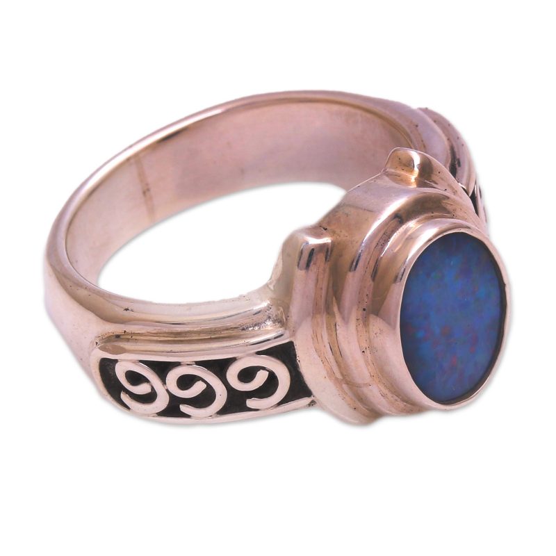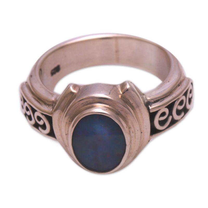 The Mutiara Collection presents this handmade sterling silver ring with an enchanting opal doublet. The sterling silver ring band is adorned with swirl motifs that enhance the beauty of the opal stone set at the ring's crown. With its soft curves and lustrous opal, this ring can enhance a formal style or dress up a casual outfit. Its design hints at the ocean, the sky, and the kind of freedom we wistfully dream of in our daily lives.