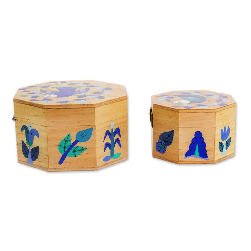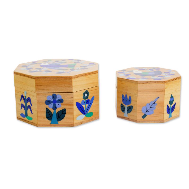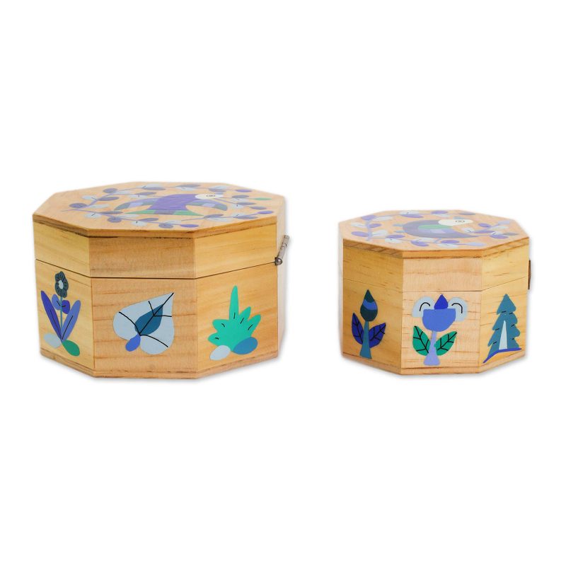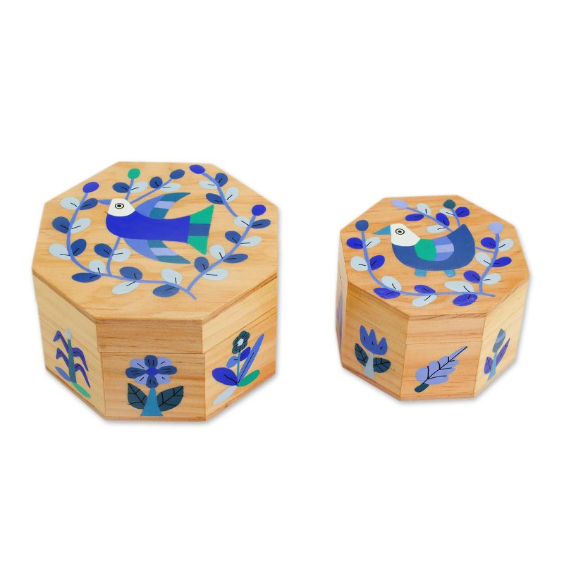 Delivery EstimateCrafted of pinewood into octagonal shapes, this pair of decorative boxes is presented by God's Seed. The skilled artisans of the cooperative design the large and small boxes, hand-painting them with birds perched on leafy branches in blue. The large box opens with brass hinges, and the small box opens with hinges made of leather.