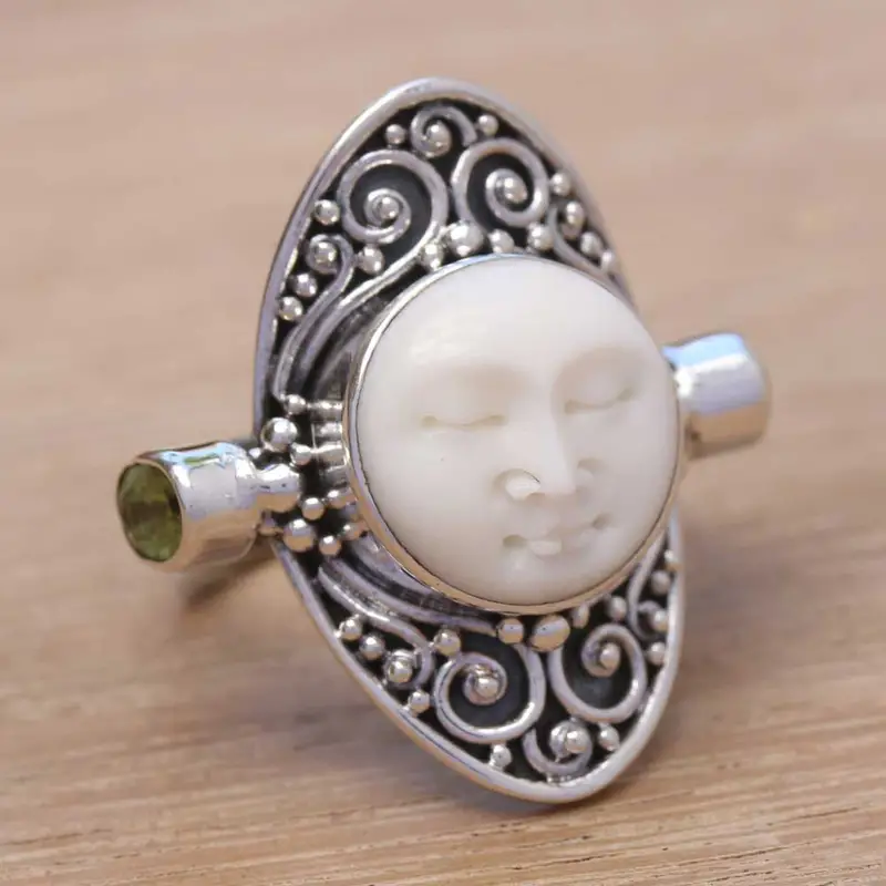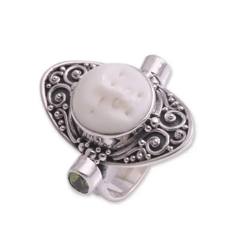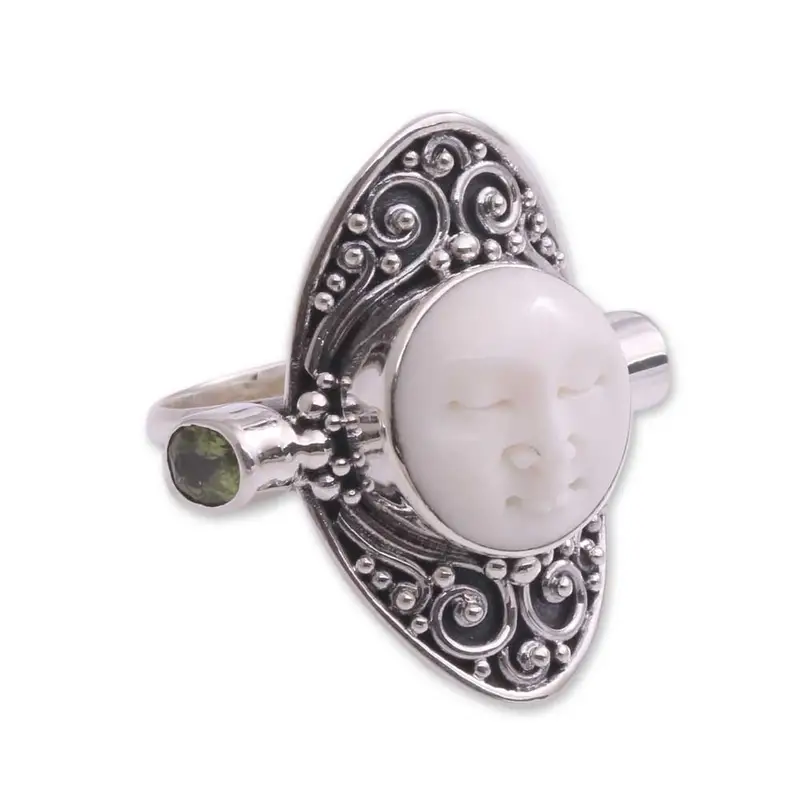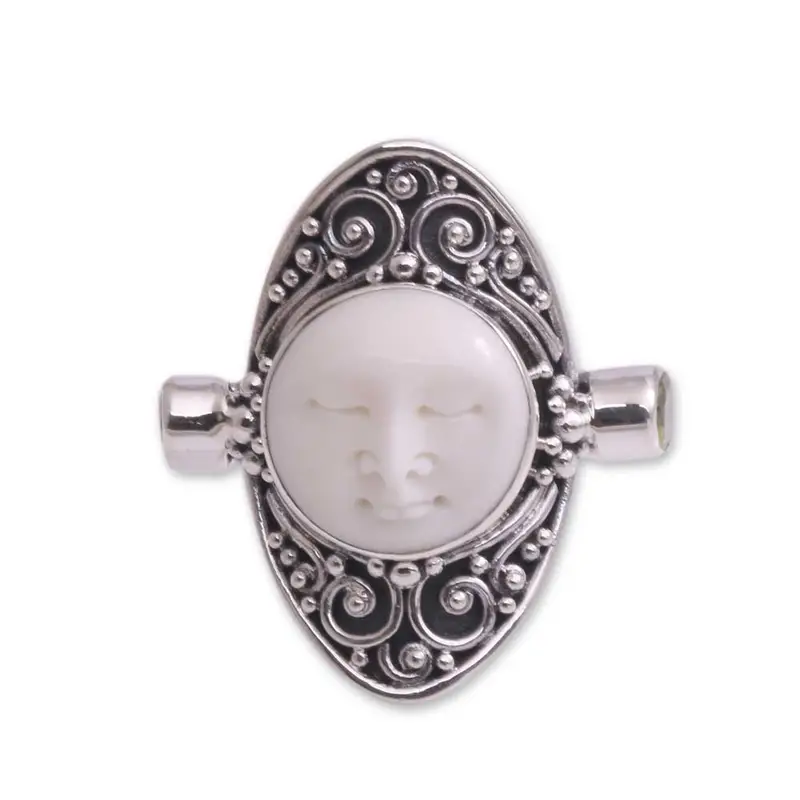 Eyes closed in an expression of tranquility, a sleeping face is hand-carved of bone to center this stunning cocktail ring from Bali. Buana crafts the ring of sterling silver, framing the snoozing face with swirl and dot motifs in a combination of finishes. Sparkling peridot gems decorate the sides of the face.