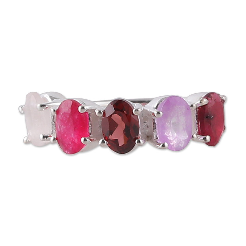 A dance of love, tenderness and passion spreads its sublime aura around a design by Neetu Barathi of India. Working with artisans with expertise in classic Indian jewelry arts, Neetu creates this sterling silver cocktail ring in a refined high-polish finish. Gems of quartz, rose quartz, ruby and garnet crown the front with elegant oval cuts and faceted finishes that total over one carat.