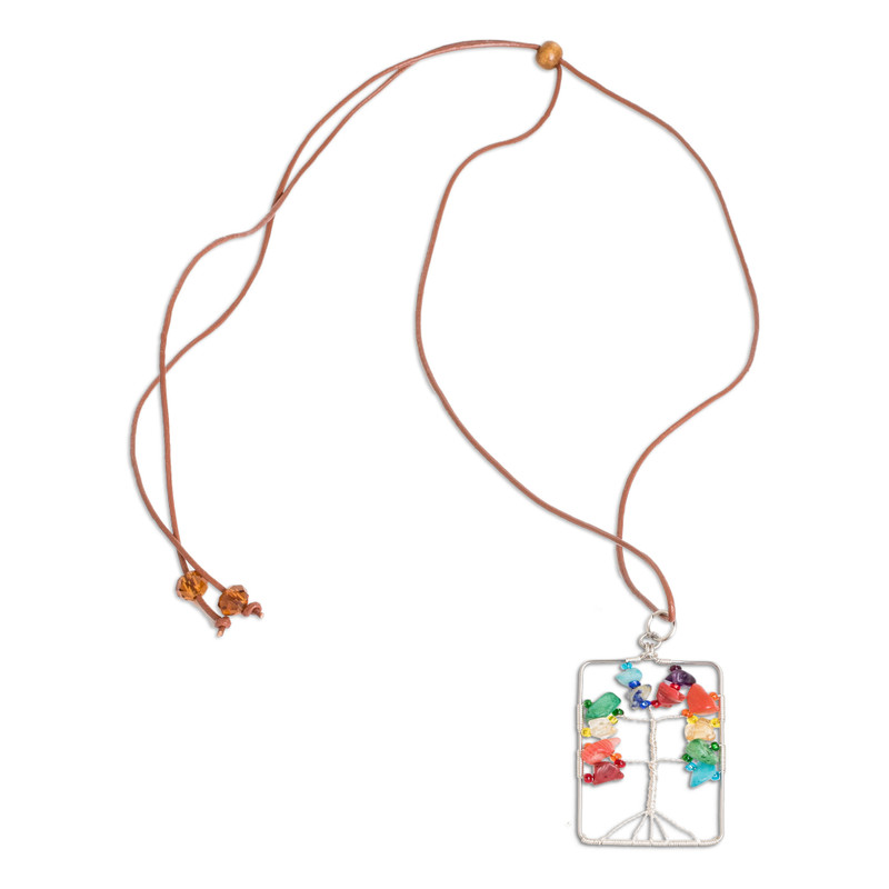 Delivery EstimateA rainbow of harmonious hues bathes a stunning creation directly from Guatemala. Artisan Domingo Reanda handcrafts this adjustable necklace from polished stainless steel wires, whose sinuous formations create a wondrous tree pendant crowned with a precious combination of jasper, citrine, amethyst, quartz, glass beads and crystals—all contained in an elegant rectangle frame that dangles from a comfy leather cord.