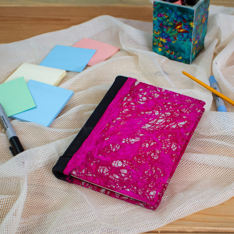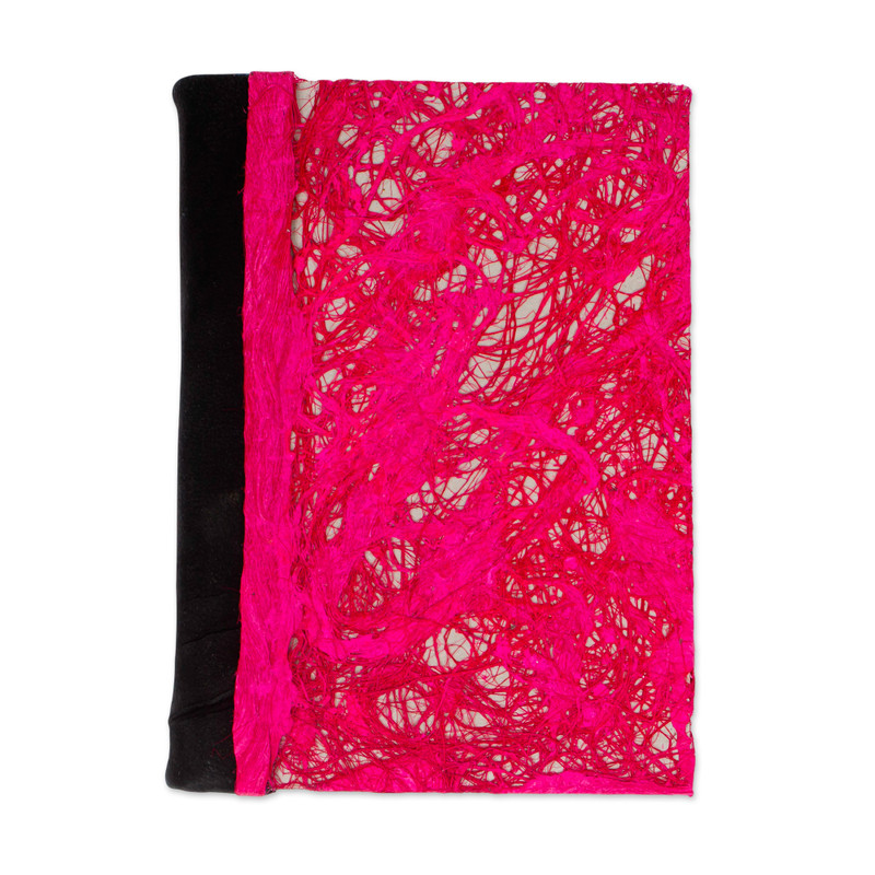 With webbed motifs in fuchsia, this journal is handcrafted of recycled paper by Mexican artisan Indira Flores. She applies the designs using colors from the bougainvillea flower, lining the spine with black leather. The journal opens to 101 pages of recycled paper.