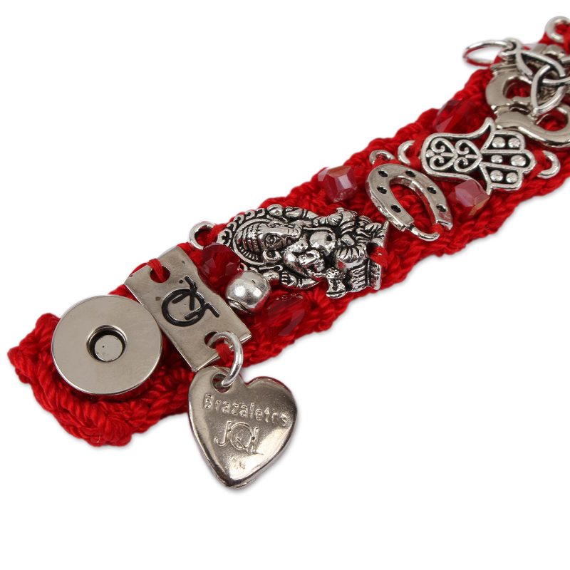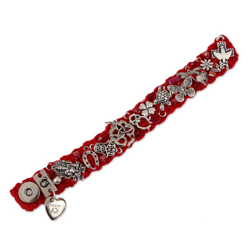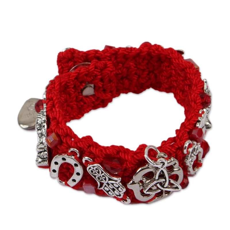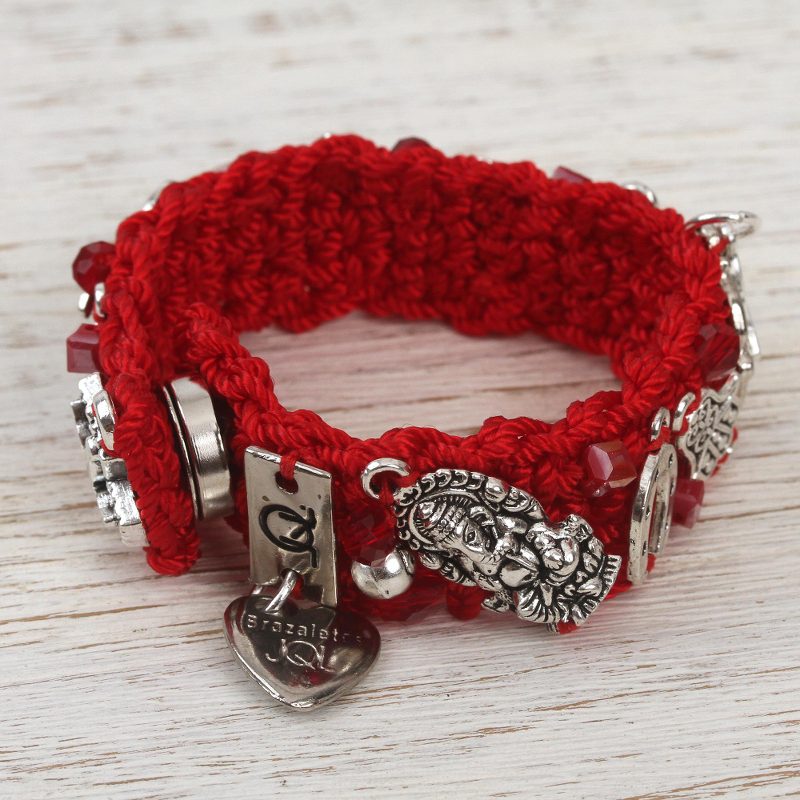 Bringing protection and good luck, this striking bracelet from Mexico features a whimsical variety of charms, including a dragonfly, elephant, hamsa symbol, and a cross. Janeth Quintanilla takes pride in her original design, braiding the accents along a length of red cord.