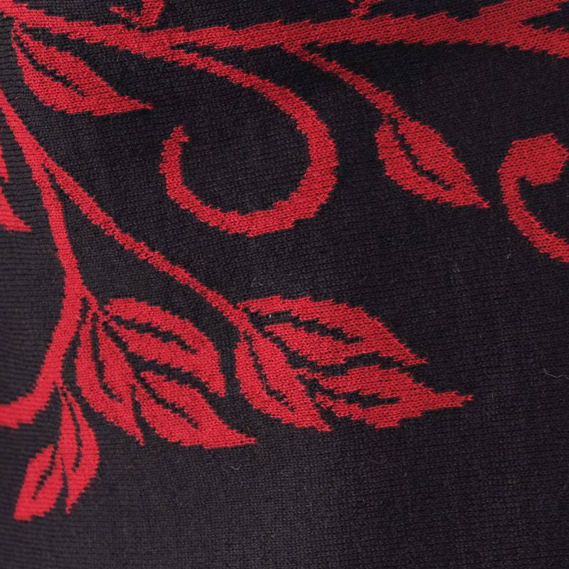 Red and black leaves intertwine in a beautiful design by Waldo Berrios. Working in a cozy blend of alpaca wool, he creates a reversible shawl with long, luscious fringe. Alpaca is renowned for its lightweight warmth.