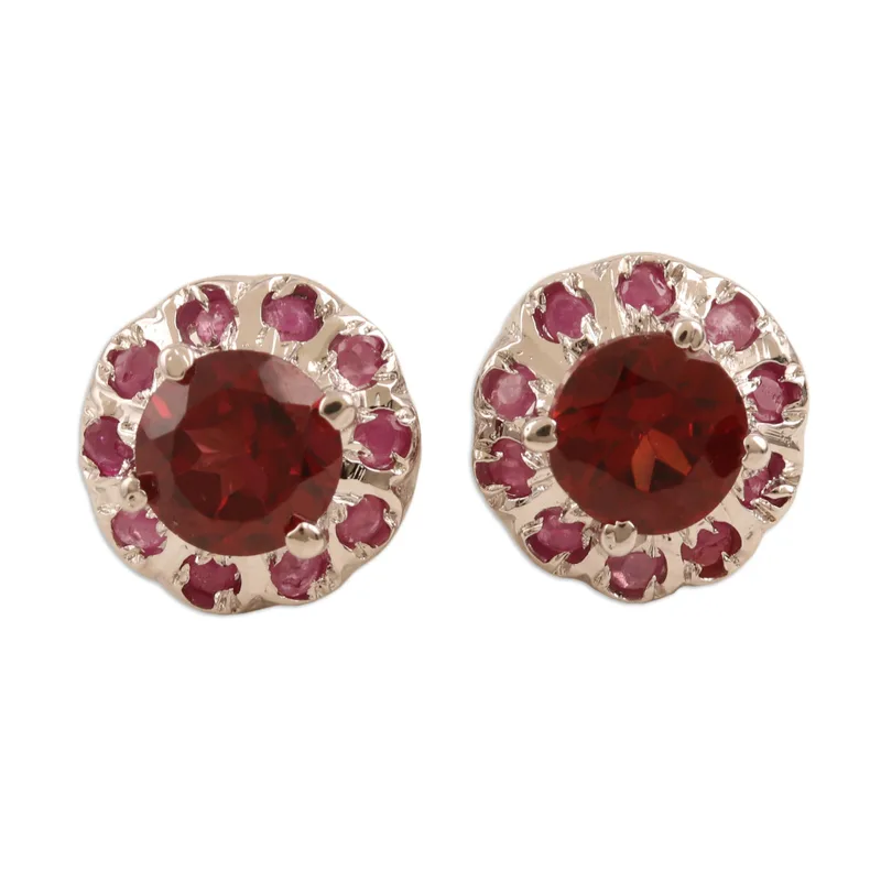 Harmonious pink and red gems come together on Bhavya Jain small but stunning stud earrings. The artisan crafts the earrings from rhodium-plated sterling silver, centering the pair with a single faceted garnet stone. A ring of deep pink rubies circle the garnet with sparkling beauty.