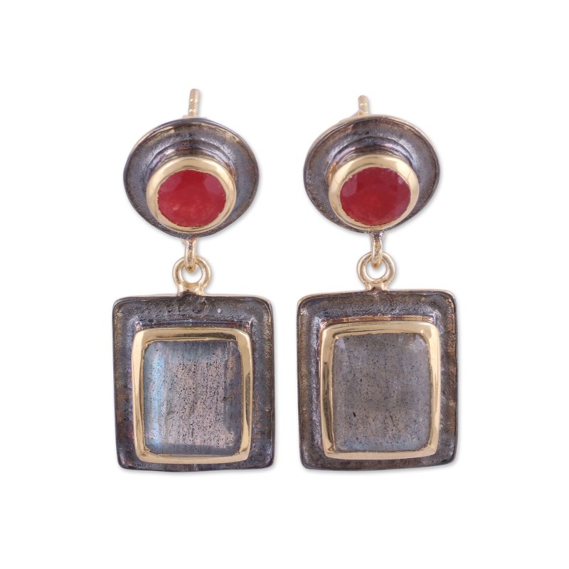 Six carats of labradorite are paired with over one carat of rubies in these stunning earrings. By Indian designer Neetu Barathi, gemstones are all set in vermeil bezel settings and are bordered by a nice contrast of oxidized sterling silver.