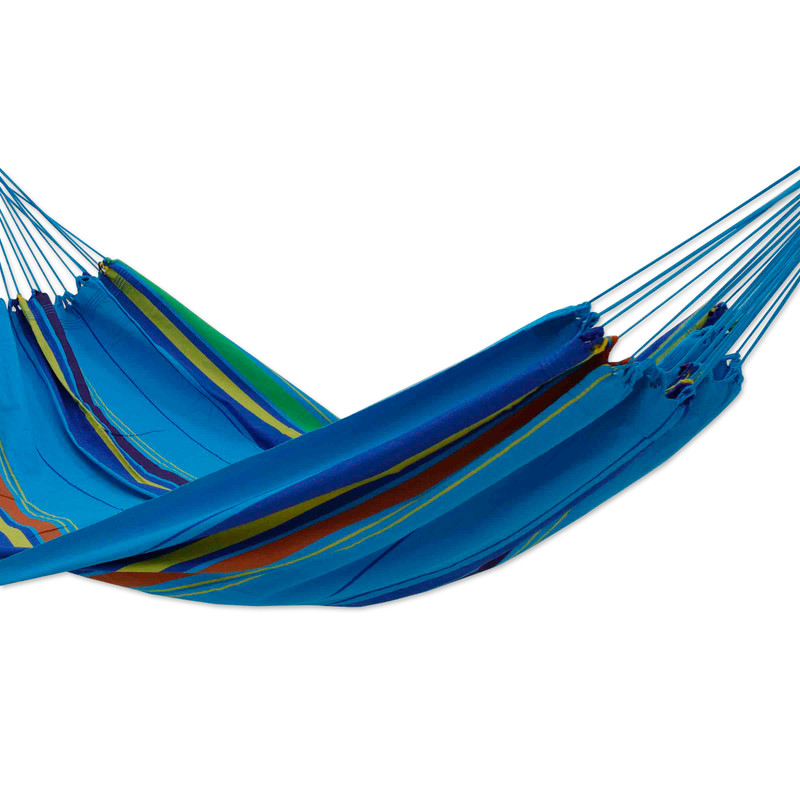 From the tropical lands of Brazil, a refreshing design comes to add extra comfort to those peaceful days of rest. Handcrafted by the Hammock Artisans of Ceará, this exquisite accessory—designed as a single hammock—is made from cotton threads for a soft sensation, featuring a striped pattern of yellow, orange, purple and green hues on a sapphire base tone reminiscent of the region's beaches.