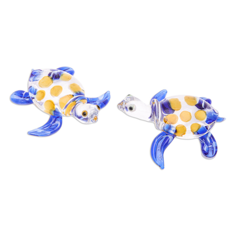 The serene and magical essence of the sea takes the form of a jolly family of five turtles, all handcrafted in Thailand by Panapai. The artisan uses handblown techniques to craft each glass figurines, adding little blue and yellow accents that enrich their peaceful aura.