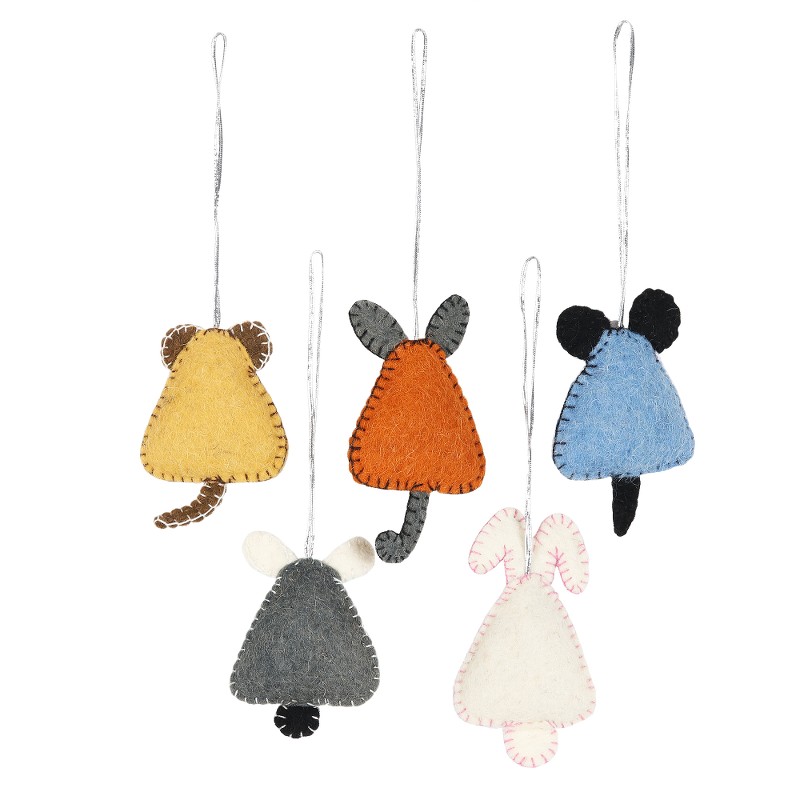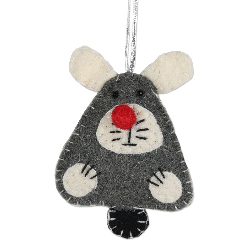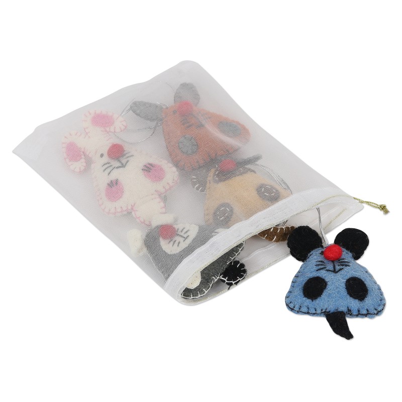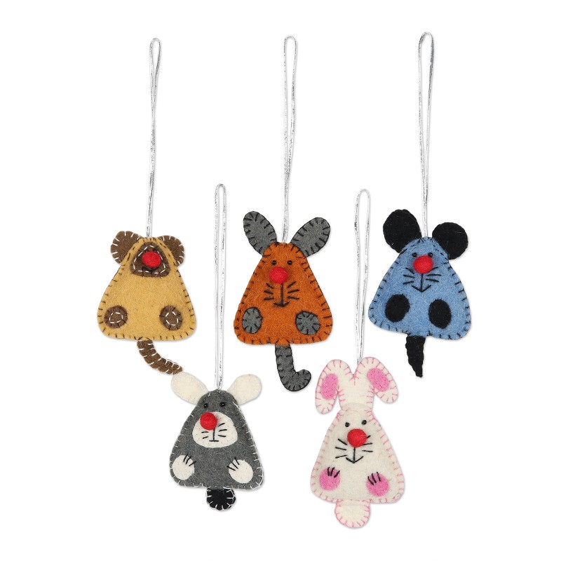 India's Rajesh Gehlot uses 100% wool felt with polyester fill to create these mischievous mice. Can you spot the imposter? A rabbit has infiltrated the Christmas tree, posing as a mouse! This set of five holiday ornaments are handcrafted, with embroidered details and glass bead eyes.