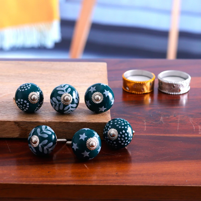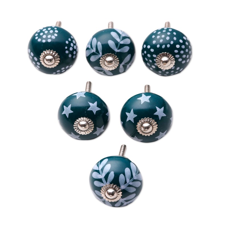 Stars, leaves and speckles don't seem to have a connection, but in Chirag Choudhary's newest design, everything makes sense. Crafted by talented Indian artisans, this set of six ceramic knobs features a teal base hue enhanced by diverse blue motifs, creating a whimsical theme that will transport your home decor to a sweet and fun realm. The accessories also feature nickel-plated iron fixtures that allow for a reinforced setting.