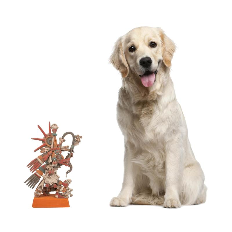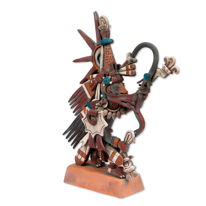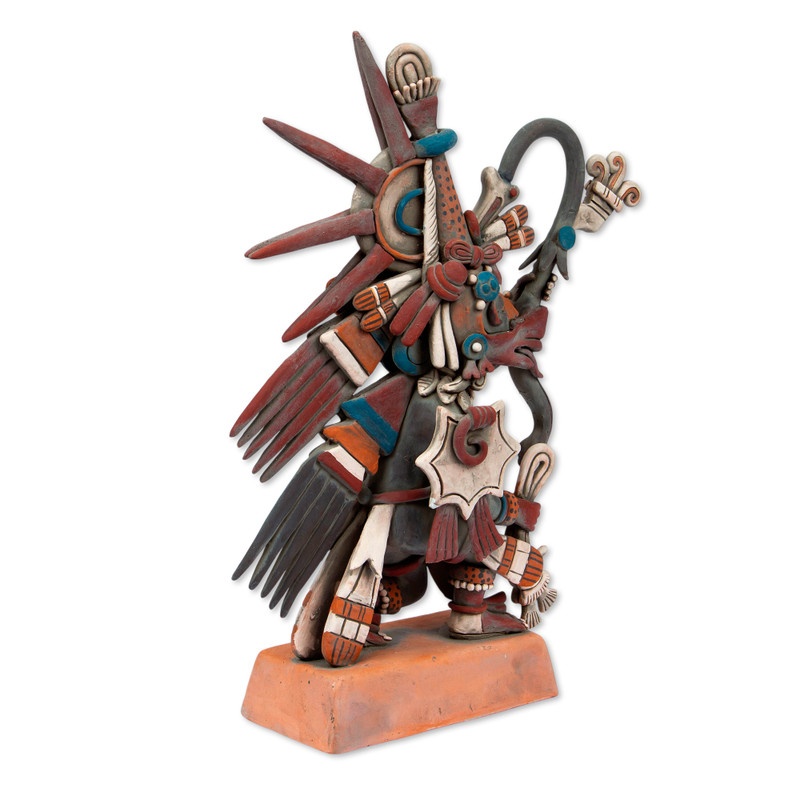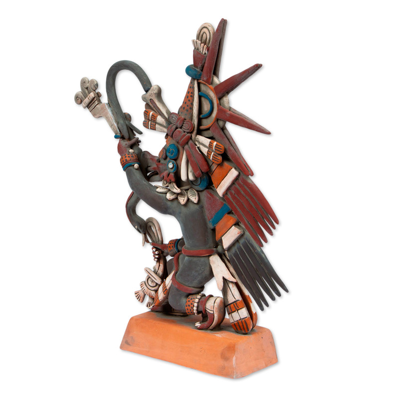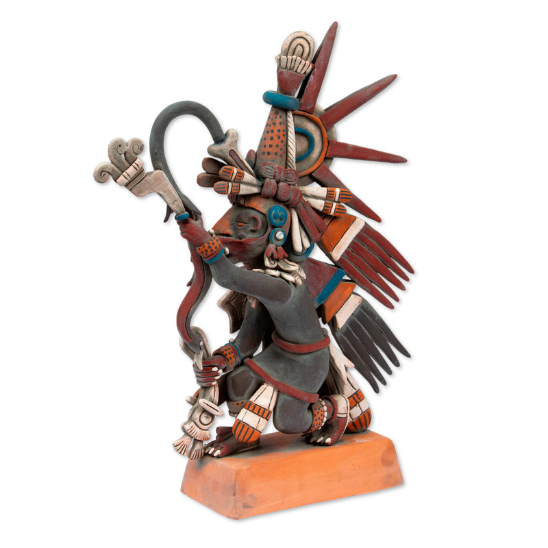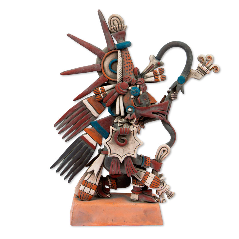 The most important deity in the Aztec pantheon, Tezcatlipoca or Quetzalcoatl is also one of the oldest, first appearing during the pre-Mexica Teotihuacan era. He is the god of fertility, of the wind, of life, of maize and of agriculture, and is said to have taught humans how to measure time and create the calendar. Working in ceramic, Angel Cerón interprets an image depicted in the Codex Borbonicus.