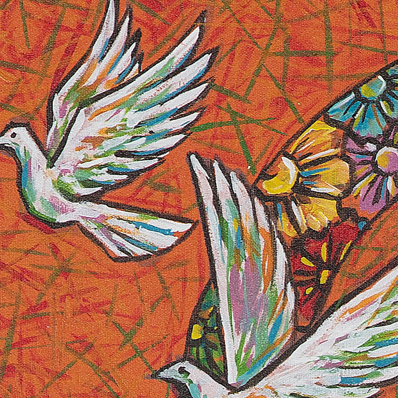 "Life is not seeking victory and fighting to kill each other, but playing beautiful and peaceful melodies to create a flowery world," says Harman while finishing a stunning expressionist composition that calls for peace and love. The Balinese artisan uses sharp brushstrokes and acrylic to depict a woman looking at the doves that fly around a floral peace symbol. Aimed to create an inspirational ambiance, this painting comes unstretched and signed.