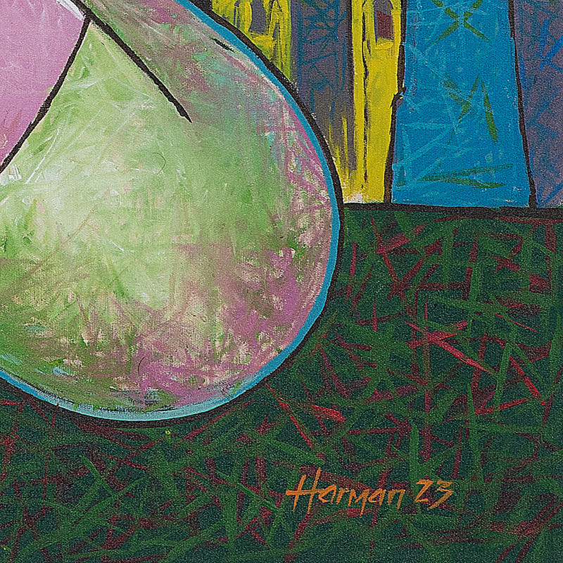 So beautiful and colorful! I purchased three from the series and framed this lovely painting with a dual yellow with silver and black frame. The painting picks up light and is so amazing. Harman is a true talent. I love his work.