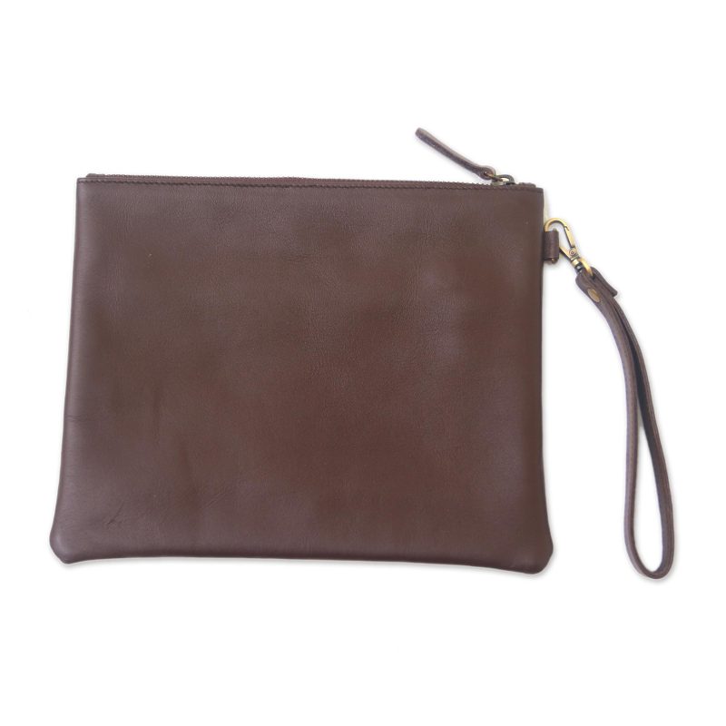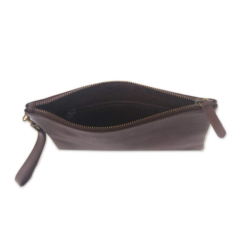 Ideal for holding clutch-style or dangling around the wrist on a removable strap, this simple handbag is designed by Hilmy Arifin in Bali. She crafts this handbag from supple leather in a solid espresso hue. The bag opens with a zipper to a faux suede lining with a zipper pocket for keeping small items handy.