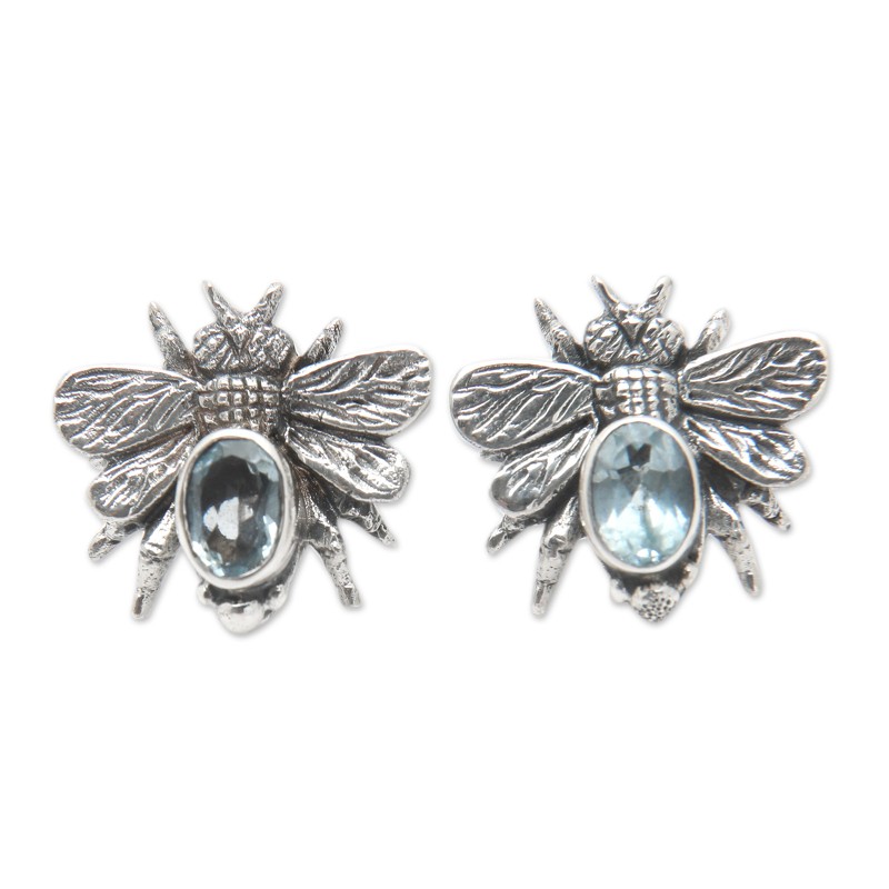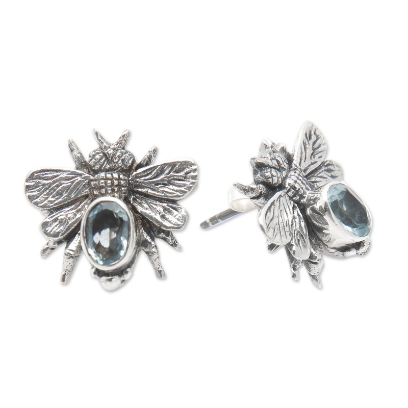 Bees' gracious and sweet essence comes directly from the stunning lands of Bali to add a unique accent to your outfits. Known as the hardworking spirits of nature, these cute bugs inspire Ayu Ary's sterling silver button earrings, polished to enrich the glamorous blue topaz stones set at the center of each piece. With a dazzling light adding a serene vibe to the accessories, the jewels symbolize loyalty and trust.