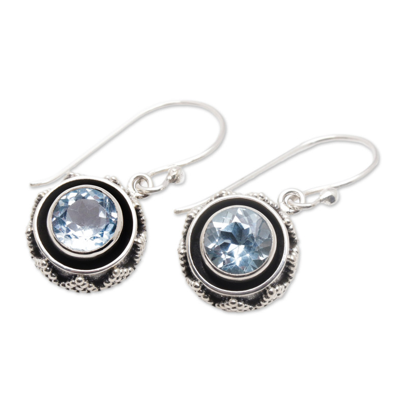 Mount Batur is an active volcano in Bali that inspires artisan Made Sugi for this pair of breathtaking dangle earrings where the faceted and round blue topaz gemstones are the absolute stars. The heavenly earrings are crafted from sterling silver with a beautiful combination finish.