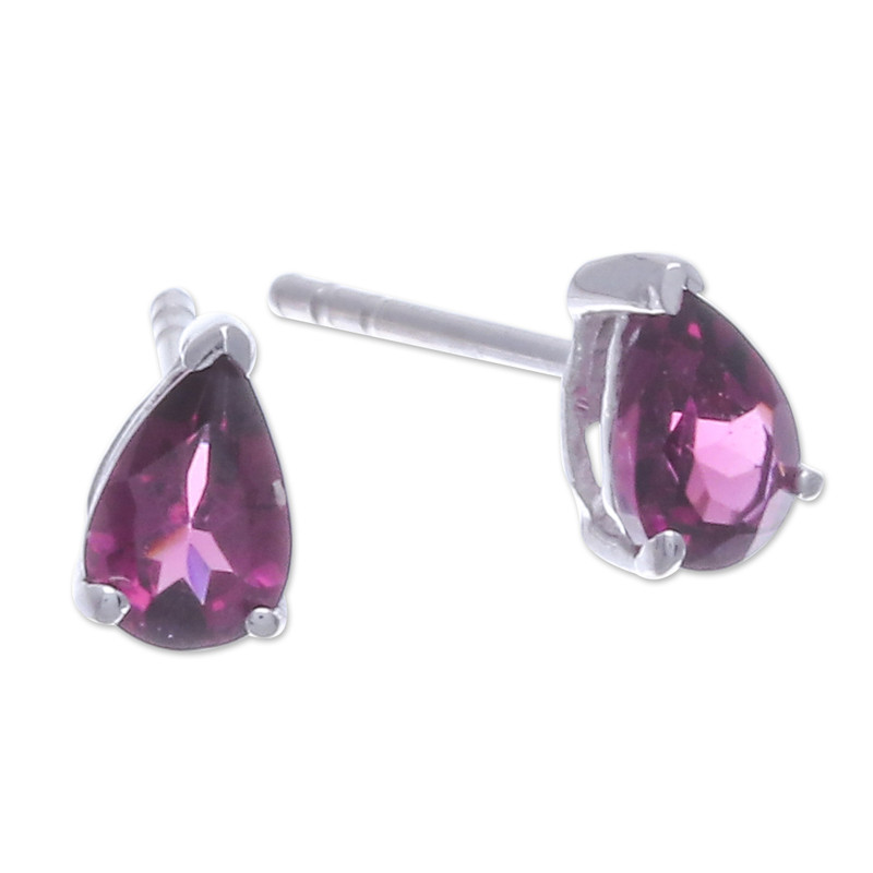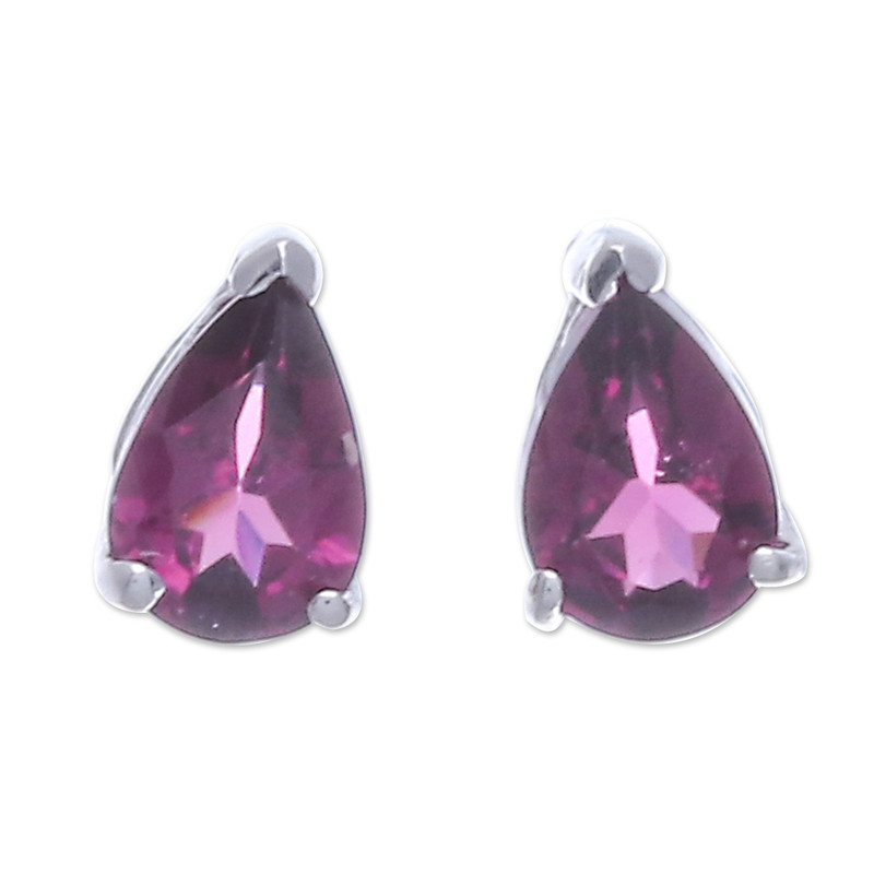 In jewelry, it is often believed that the pear cut represents a tear of joy, making this gemstone shape prominent in glamorous accessories. Drawing inspiration from exquisite trends, Thailand's Roongnapa presents these sterling silver drop earrings with two natural rhodolite jewels in a faceted style and pear shape, symbolizing eternity.