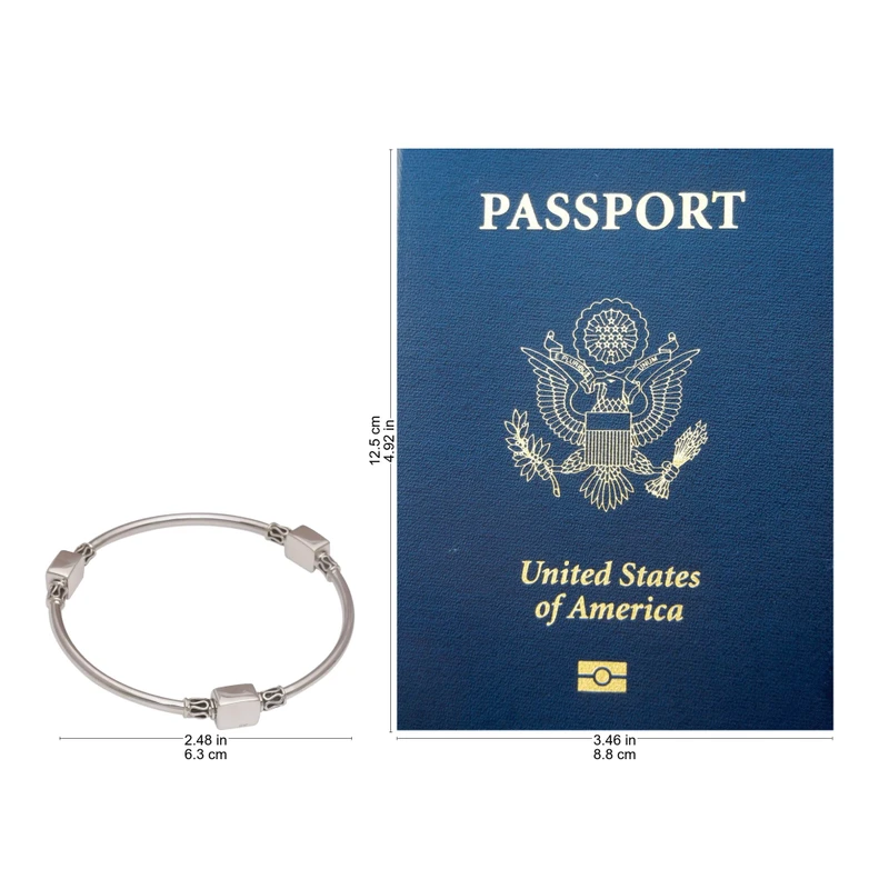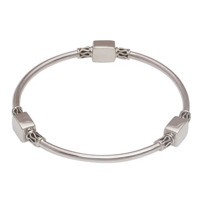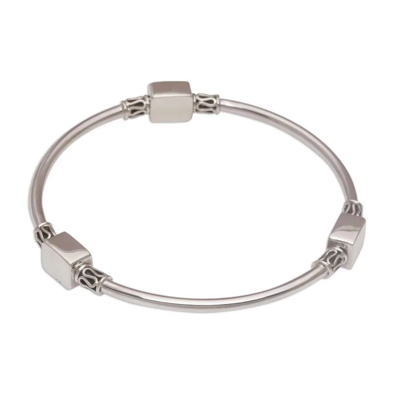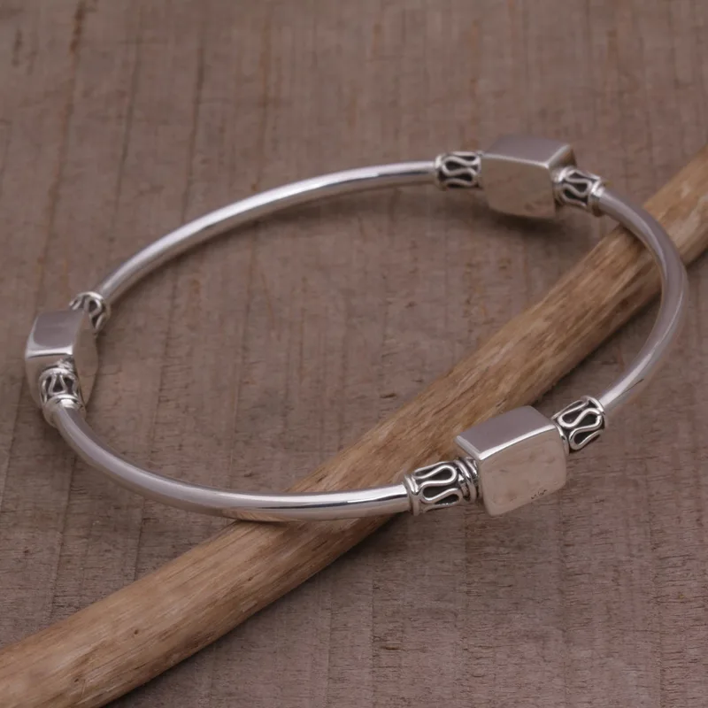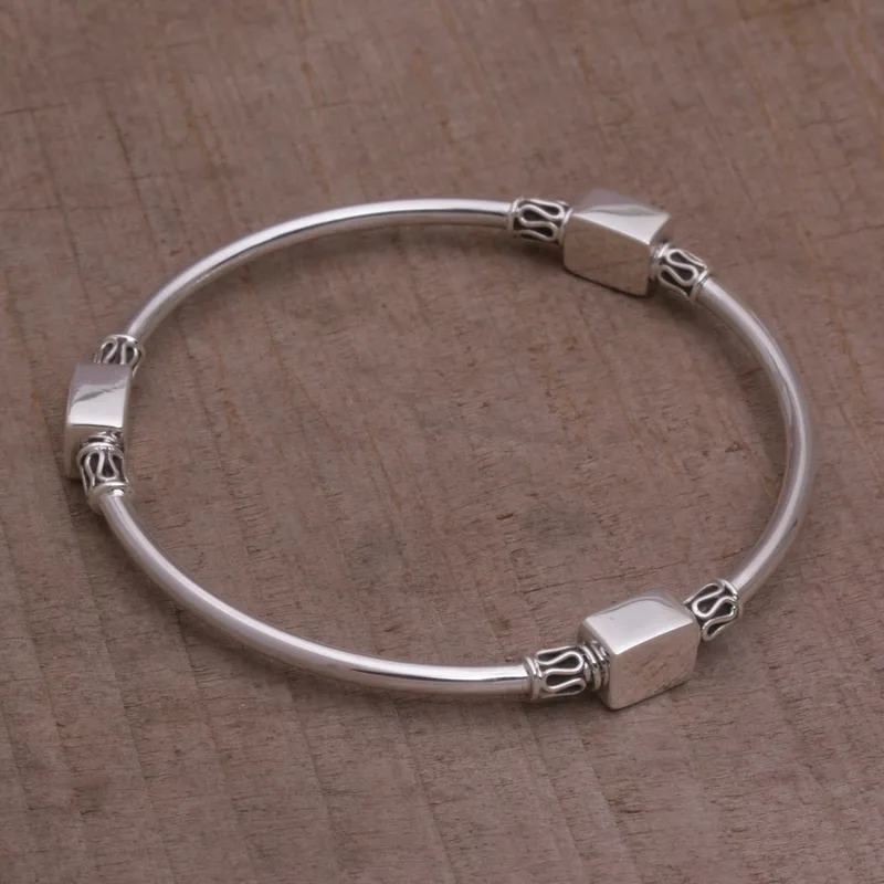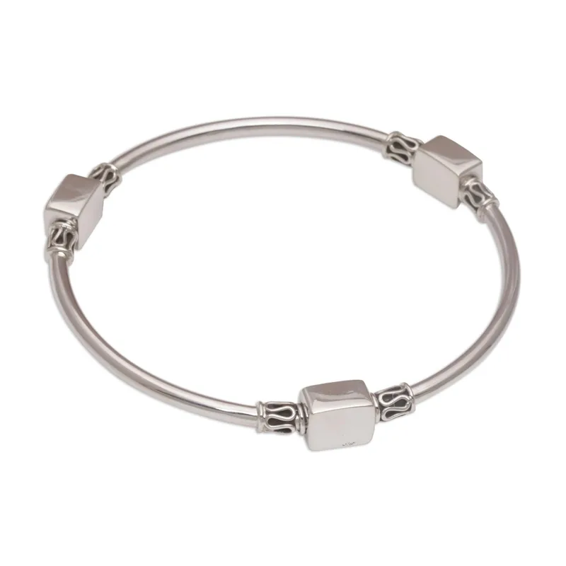 Komang Suastra handcrafts this Balinese bangle bracelet of sterling silver. He elaborates the band with wave motifs and reflective cube shapes at three points. This elegant accessory pairs well with any outfit.