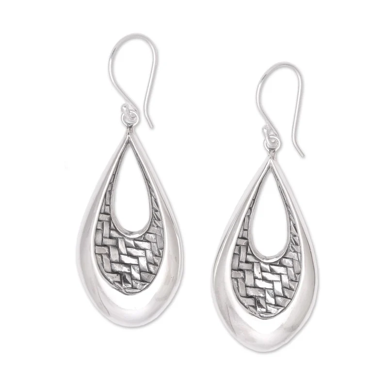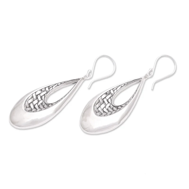 Drawing inspiration from traditional Balinese weaving, Dewa Arimbawa handcrafts a pair of stylish earrings. Sterling silver drop-shaped components feature a center weave panel motif, while the outer edges are sleek and polished.