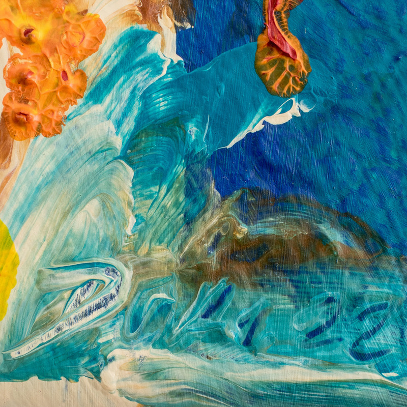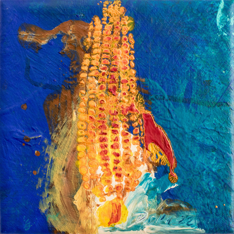 Corn has nourished humanity for hundreds of years, becoming a symbolic element in many cultures. David Fernando Duke from El Salvador is also fascinated by this nutritious vegetable, creating an abstract composition from acrylic and oil. Using a palette of cool hues, the artisan adds a corn image on top of the blue background, all in a warm palette for a contrasting style. Made in honor of the prosperous fields of his homeland, the painting is also titled Tiempo de Cosecha I in Spanish.