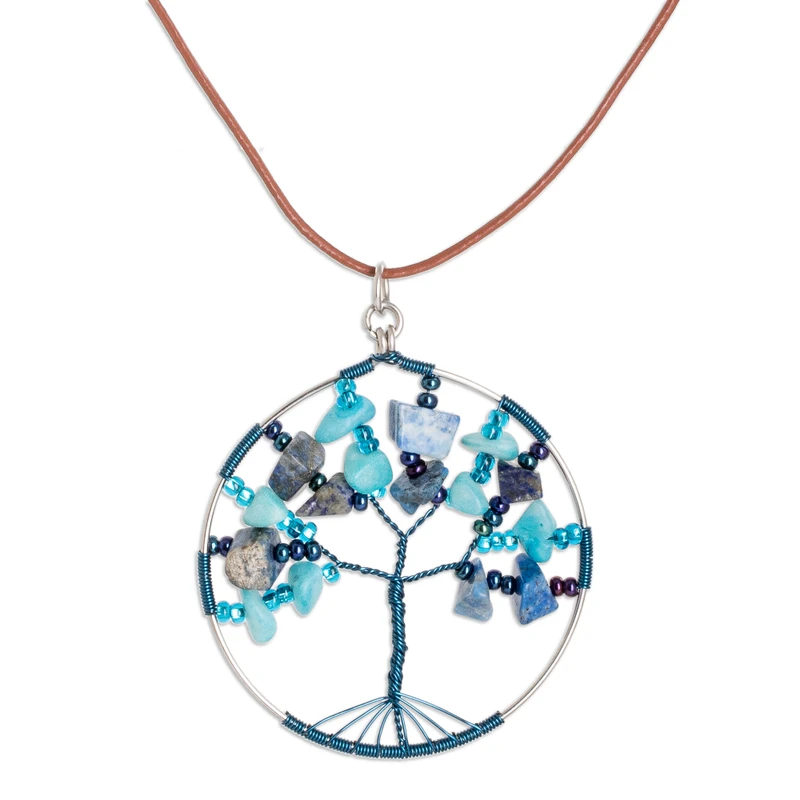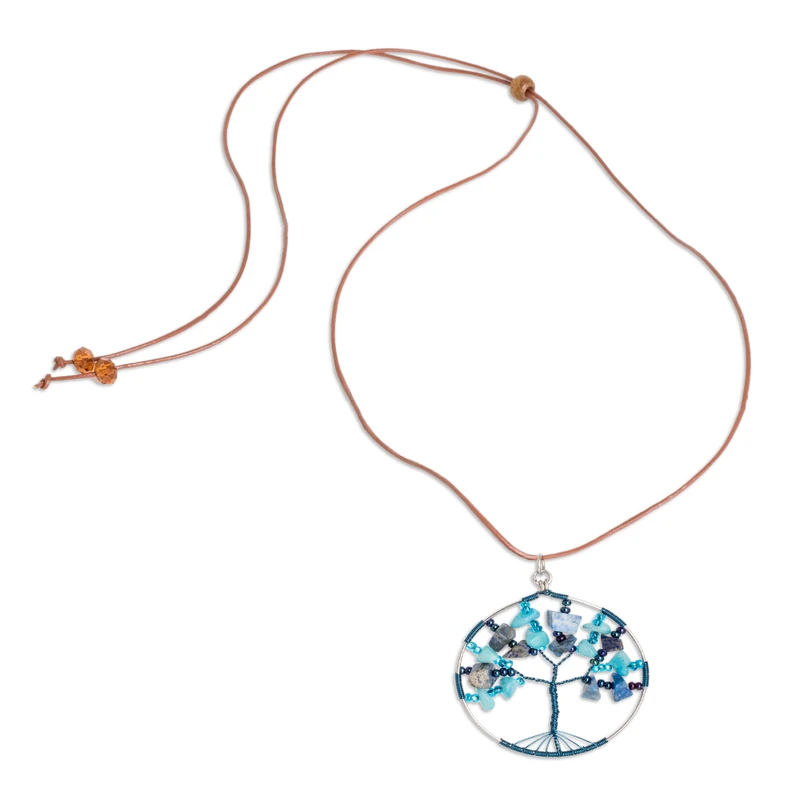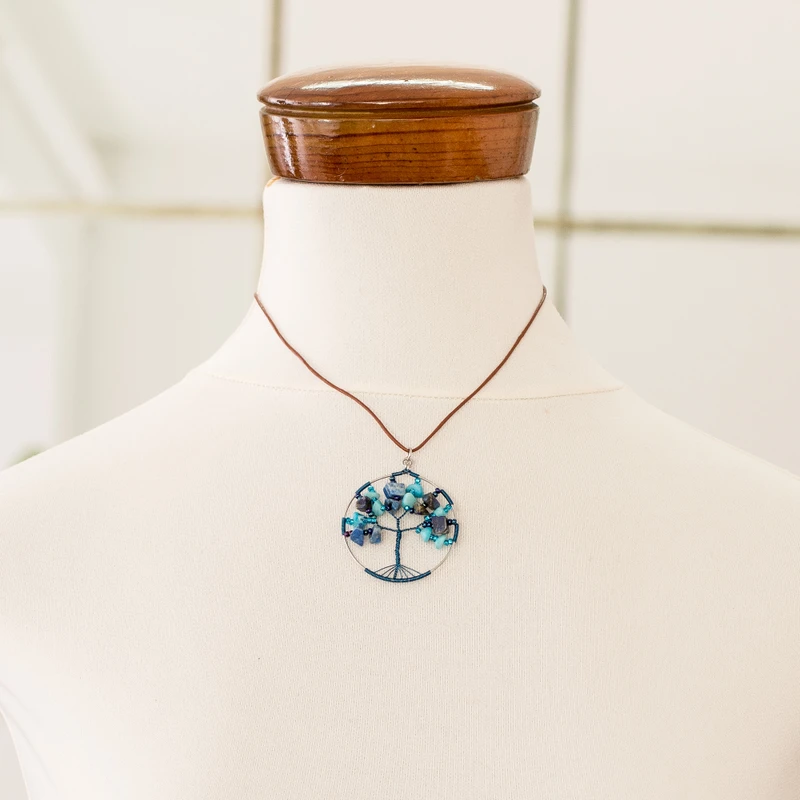 Blue jasper and quartz stones merge with glass and crystal beads to create a oneiric illusion in Domingo Reanda's newest design. Crafted in Guatemala, this adjustable necklace features a round pendant made of stainless steel wires, whose sinuous formations form a tree as a symbol of prosperity and fantasy. The piece is also accented with a comfortable leather cord and a polished finish.