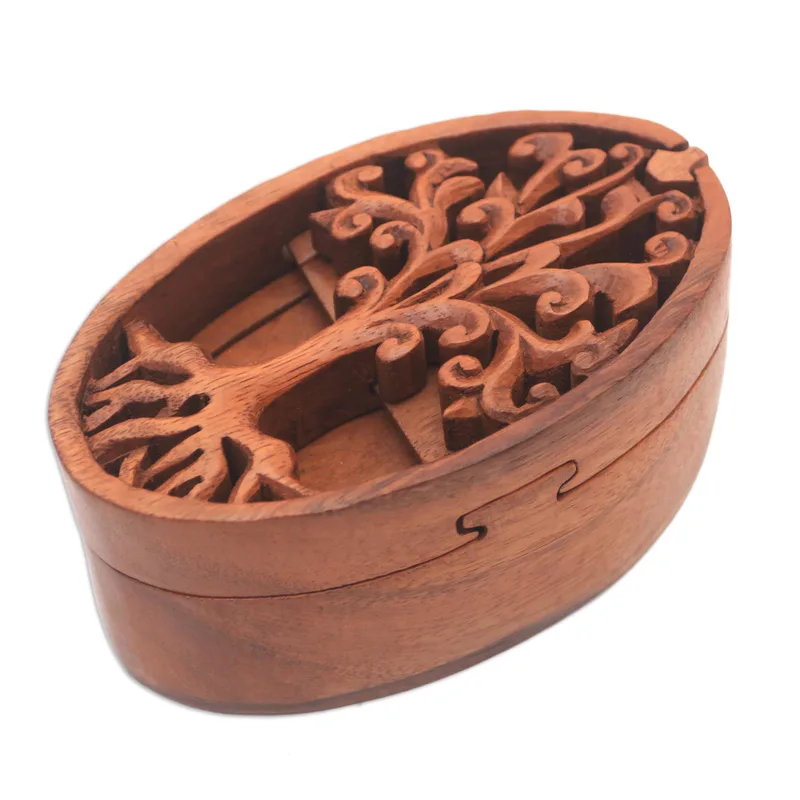 Diligently carved by hand in an oval of suar wood, a beautiful tree fans its curling branches on the lid of this puzzle box from Bali. Sarwaedi creates this puzzle box, which opens with three separate pieces to reveal an interior for storing small items and keepsakes.