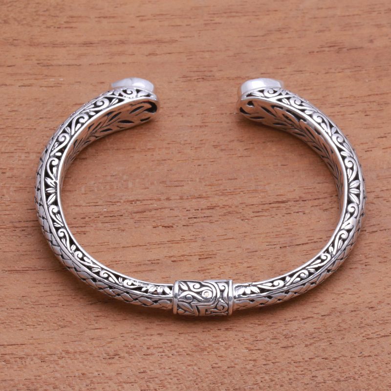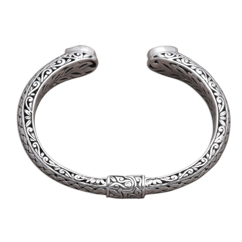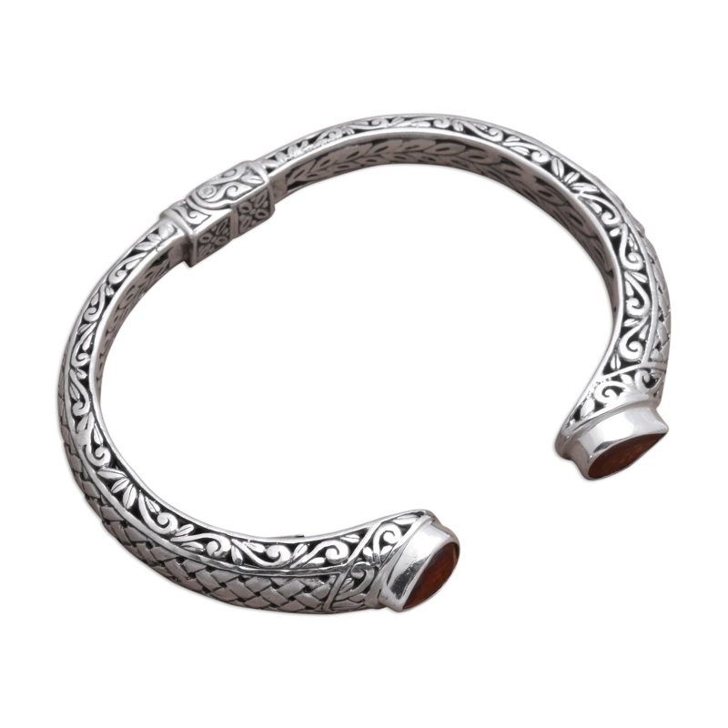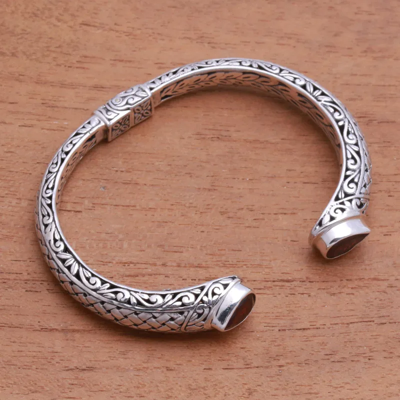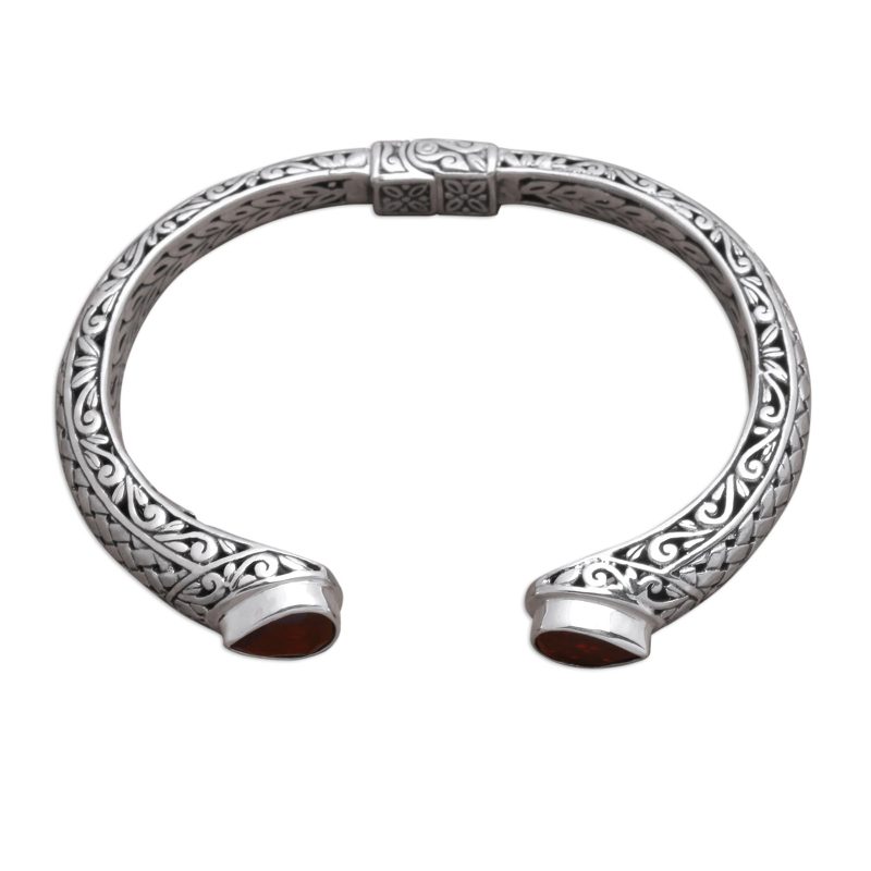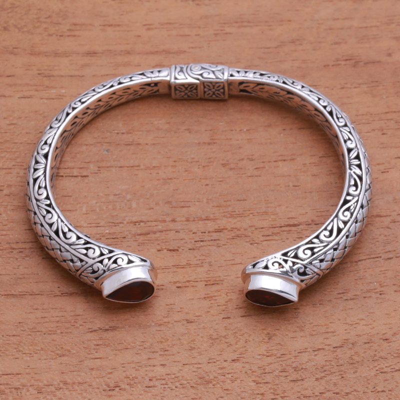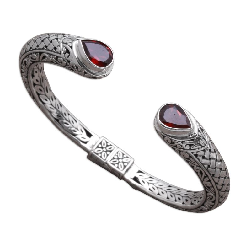 Resembling a woven basket, intricate patterns in sterling silver circle the wrist with elegance. Balinese artisan Giri Tasmana creates this cuff bracelet, which culminates in faceted teardrops of garnet that total over two carats. The bracelet opens with a concealed hinge to fit the wrist.