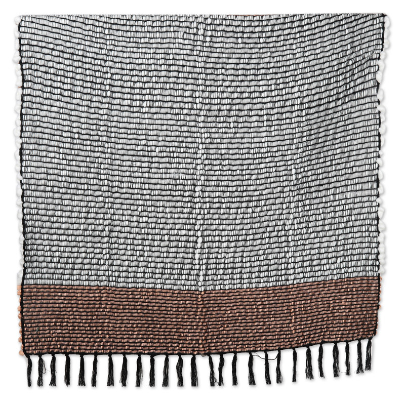 Indian artisans follow traditional techniques to craft a polyester and acrylic throw blanket with a soumak-like weave. Presented by Sandeep Malhotra, this accessory comes in a palette of pale apricot, white and black tones, all arranged in a striped pattern for a unique look. Furthermore, the item features little fringes that dangle at the end.