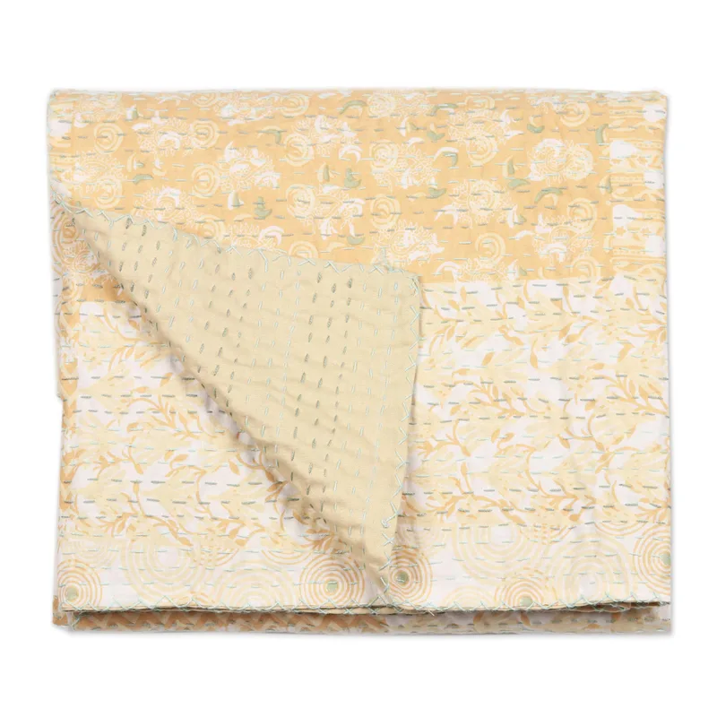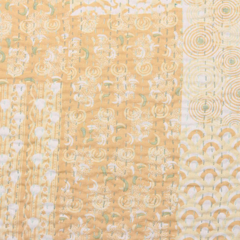 Indian artisan Anil Khandelwal uses lively printed motifs resembling patchwork to create these vibrant bedspreads. Finished with a contrasting running kantha stitch all over. In lovely sunflower and white that reverses from printed to solid. Comes with two matching pillow shams.